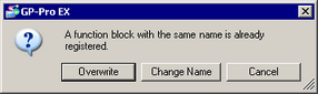 When the FB selected in the [Package] has the same name as one of the FBs registered in the [Screen List] window, the following dialog box opens where you can select either to overwrite existing one, or to register with a new name. When the dialog box does not appear, or when you have selected [Overwrite], proceed to Step 6.