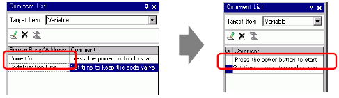 Use the [Comment List] to view variable, symbol, system variable, and rung comments in the logic program.