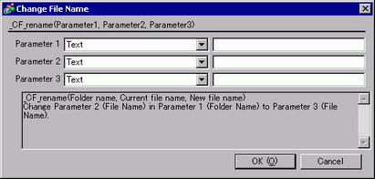 Modifies the file name. Parameter 1 designates the CF Card data folder. Parameter 2 designates the original file name. Parameter 3 designates the new name.