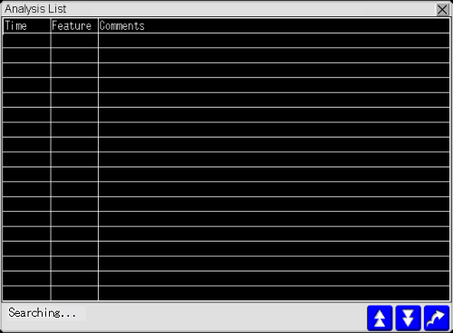 Touch [START]. The search process starts, and the Analysis List screen opens with the text "Searching…" blinking. The bit 0 of the system variable "#H_AlarmSyncStatus" (Alarm Analysis State) turns ON.