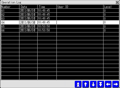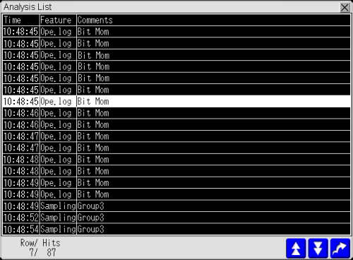 Once the search is complete, the Analysis List displays the operation log records and/or sampling group records retrieved from the display unit's internal memory or external storage.