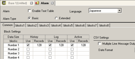 In the Block Settings, select the check box for the desired display mode (History/Log/Active) for the block to which the message is registered, and set the number of messages stored as history for each mode.