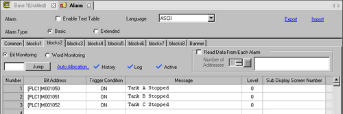 In the same manner, open the [blocks 2] tab and register the Monitoring Bit Addresses and Alarm Messages for Line 2.