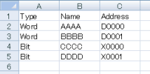 1. Prepare a file with the symbol name, type, and address. (The following diagram shows a CSV file in Microsoft Excel.)