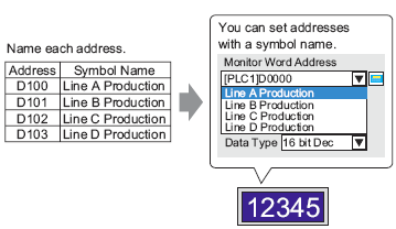 You can assign names to each address. (This name is called "Symbol"). Parts and other objects can use the symbol name in address fields. You can change the address associated with a symbol when necessary, without affecting address settings in Parts and other objects that use the symbol.