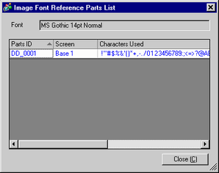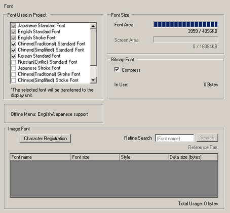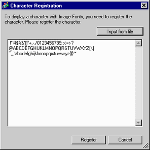 To display image fonts in the [Text Display] and [Input Display], the characters need to be registered in the [Character Registration] dialog box. Up to 20,000 characters can be registered.