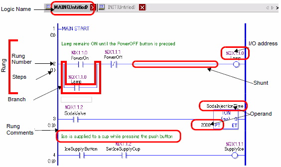 Consists of zero or more instructions or one label. The maximum number of instructions per rung is 150. The maximum number of branches is 50.
