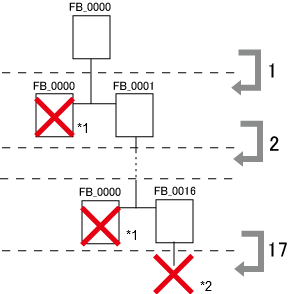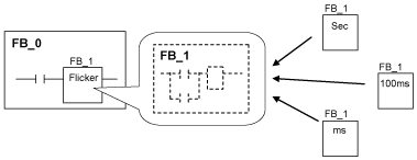 This is useful when you want to call an FB (FB_1) and replace the process performed by the FB. For example, if you are using FB_1 whose output bit flickers based on the number of seconds specified in FB_0, you can register multiple FB_1s with different flickering units to packages. You can modify FB_0 easily by unpacking suitable FB_0 as necessary.
