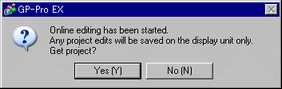Online Editing edits logic programs in the display unit on a computer, so edited content is not reflected in the project files (*.prx) in the computer. After online editing, the following dialog box appears when the online monitor is closed. If you want to updated the project file with the edited contents in the PC, click [Yes (Y)]. Otherwise, click [No (N)].
