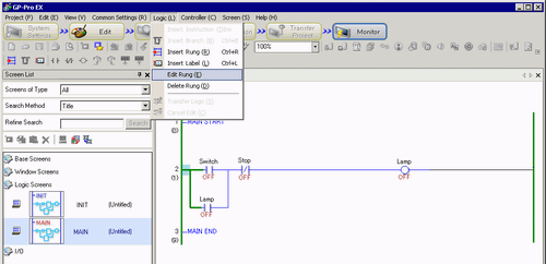 In Online Editing, you can edit only a single rung at a time. Click [Edit Rung (E)] in the [Logic (L)] menu to edit the selected rung. Click [OK (O)] to transfer the edited logic program to the display unit.