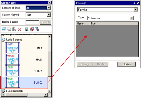 Select the subroutine you want to register with the package in the [Screen List] window, and drag and drop it to the [Package].