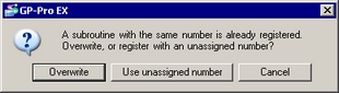 When the subroutine selected in the [Package} has the same name as one of the subroutines registered in the [Screen List] window, a confirmation dialog box opens where you can select either to overwrite existing one, or to register with a new name. However, if there are already 32 subroutines in the [Screen List], you can select only [Overwrite].