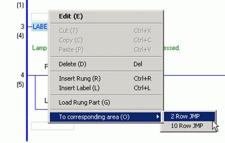 Right-clicking the label and selecting [to Corresponding Area (O)] - [*th rung JMP] (* means rung number) causes the cursor to move to the corresponding JMP instruction.