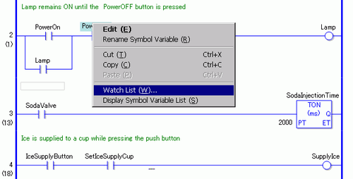 Right-click the symbol variable that you want to monitor within the logic program and then click [Watch List (W)]. The symbol variable is added to the [Watch List] window.