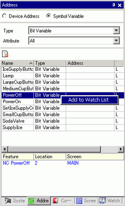 You can also add the variable by selecting [Symbol Variable] in the [Address] window, right-clicking the symbol variable that you want to monitor, and clicking [Add to Watch List].