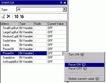 You can check how operations are affected when you change the current value of each address. to check operations when the [Type] is [Bit Variable], you can right-click to select [Force ON (C)] or [Force OFF (O)].