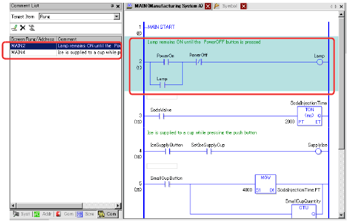 When [Target Item] is [Rung], double-click a cell in the [Screen Rung/Address] column to select the rung in the logic with the comment you want to delete.