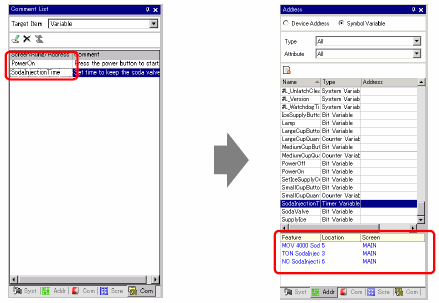 When [Target Item] is [Variable] or [System Variable], double-click the cell in the [Screen Rung/Address] column. This displays the [Address] window and selects the relevant symbol variable or system variable.