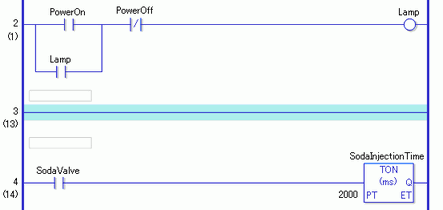 2. Insert a PT instruction on the third rung (Positive Transition) and assign the symbol variable (Lamp) to the PT instruction.