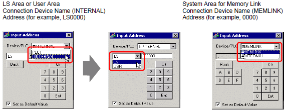 When memory link is used to communicate with the connection device (PLC), you can specify the addresses for the user area and memory link system area.