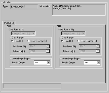 The analog values in the voltage and current output settings appear within the range of -2048 to 2047 as shown below.