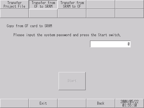 In offline mode, when you transfer from the CF/SD card to backup memory (SRAM), the values for [Brightness], [Contrast], and [Volume] do not change. Note, however, that when the display unit enters RUN mode or is turned OFF and then ON again, the transferred information is used in operations.