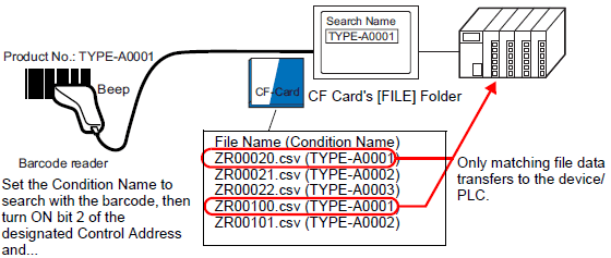 In the following example, the CSV files that match the product number (condition name) read from the barcode reader are transferred to the device/PLC.
