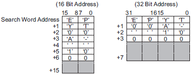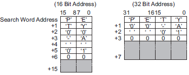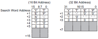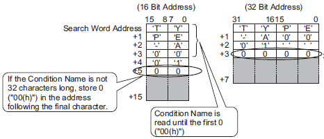If the specified name is less than 32 characters, write 0 (NULL="0(h)") or a blank space in the address following the last character. Characters before the address containing 0 (NULL="00(h)") are considered as the condition name for the search.