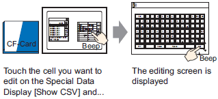 On the display unit, you can use a Special Data Display [CSV Display] or [File Manager] to view CSV data (such as recipe data, alarm history data, sampling data) stored on the external storage device. You can use this feature to check the data on the display unit.