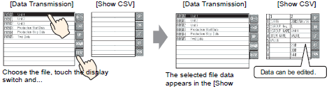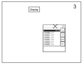 Select a file, and then touch the [DISP] key to view the file in the [Show CSV] dialog box.