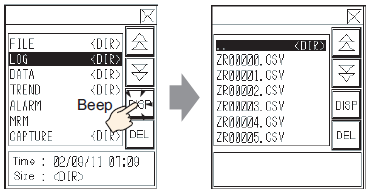To navigate to a higher hierarchical folder, select the [..<DIR>] row then touch the [DISP] key.