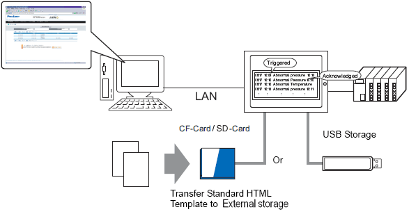 The Web Server makes alarms and device addresses available for display in Internet Explorer. You can also access files on an external storage device, allowing for simple maintenance tasks.