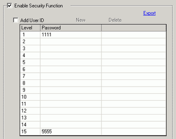 2. Password setting screen will open. Select the [Enable Security Function] check box and type password "1111" for [Level 1], and password "5555" for [Level 15].