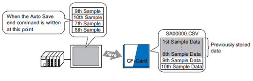 Sampling data that is stored in the display unit is output to the CSV file after sampling for the designated cycles finishes, not when writing the Auto Save command.