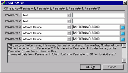 When a CSV file has two or more lines of data, the desired number of lines can be read out starting from the specified line. Up to 200 single-byte characters can be entered in a line, and up to 65,535 lines can be entered in a CSV file.