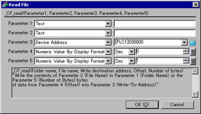 _CF_read ("\DATA", "DATA0001.BIN", [w:[PLC1]D0100], 0, 10) // (1)