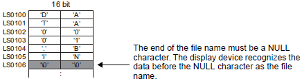 By storing the file name in LS0100, you can indirectly specify the file name. In this example, a file name is stored in LS0100 through LS0106 as follows.