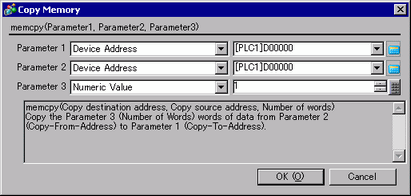 For example, memcpy ([w:[PLC1]w30.0100], [w:[PLC1]BD0100], 3)