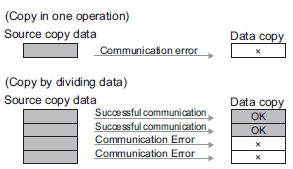 Reading from the source copy data and writing the data to the destination is performed in one operation, or it is accomplished by dividing the data into several items equivalent to the number of Addresses used for the source copy data. If a communication error occurs during data read, the result of the data copy varies as follows, depending on whether the data was processed in one operation or in several items: (Result of data write operation O: Write complete, X: Unable to write)