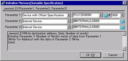 Initializes all devices at once. The Set data specified with Parameter 2 are set from the Set Word Address specified with Parameter 1 into the addresses specified with Parameter 3. The valid range for the number of addresses is from 1 to 640. The Write- to Address, Write Data, and number of addresses can each be designated indirectly.