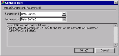 A character string or character code is concatenated with the text buffer. Adds the data of Parameter 2 (Text) to the last of the contents of Parameter 1 (Contact Data Buffer).