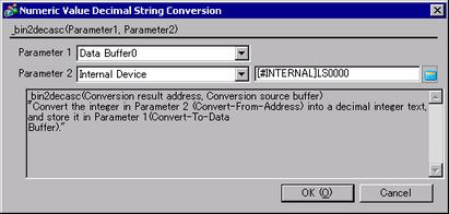 This function is used to convert an integer to a decimal string. Convert the integer in Parameter 2 (Convert-From Address) into a decimal integer text, and store it in Parameter 1 (Convert-to Data Buffer).