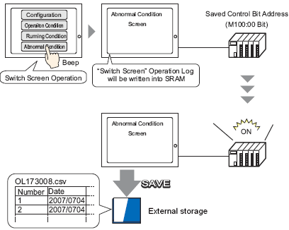 Normally, the Operation Log, which is stored in backup memory (SRAM) on the display unit, is automatically saved for a designated number of entries. You can also save to designated external storage by setting ON bit 0 in the control address. When saving, the log is converted to CSV format, so you can view it on a PC or using the [Show CSV] on the display unit.