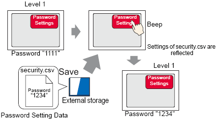 Prepare password setting data in CSV format and save it in external storage. By using a special switch for [Password Settings (File)], at run time you can update security settings by loading password setting data to the display unit.