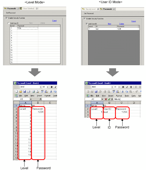 • Output data differs depending on the [Add User ID] settings' "Level Mode" or "User ID Mode".