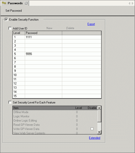 Password setting screen will open. Check [Enable Security Function] and input password "1111" in [Level 1] and password "5555" in [Level 5].