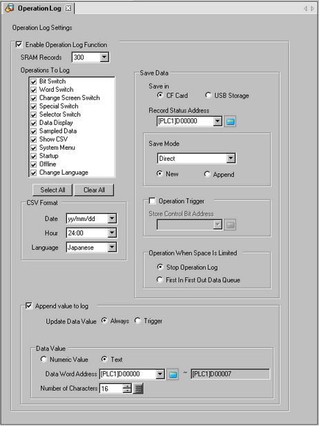 If [Save Mode] [Direct] [Append] is selected, and settings in [Append value to log] are changed, when the project is transferred and logging starts, two groups of data will exist in the same file - data with values and data without values. If you do not want to have two data sets, before transfer delete the operation log file in the external storage or rename the folder where data is being saved.