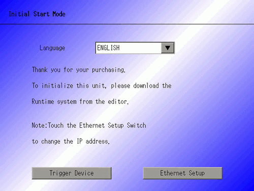 The [Initial Start Mode] screen or the [Welcome] screen is the first screen that appears after turning on the display unit immediately after purchase. After transferring a project once, this screen will not appear.