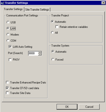 Click the [Transfer Settings] button. The following dialog box appears. Ensure that [Communication Port Settings] is set to [LAN]. Select the [LAN Auto Setting] check box and click [OK].