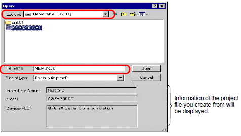In the following dialog box, select the CF Card in the [Look In] field. Select the backup file (*.cml) to convert to a project file (*.prx) and click [Open].
